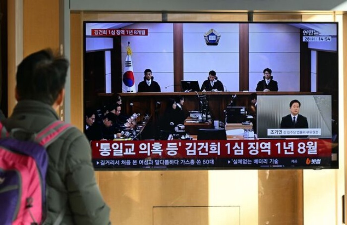▲김건희 1심 선고 재판이 열린 28일 서울역에서 시민들이 생중계 화면을 보고 있다.