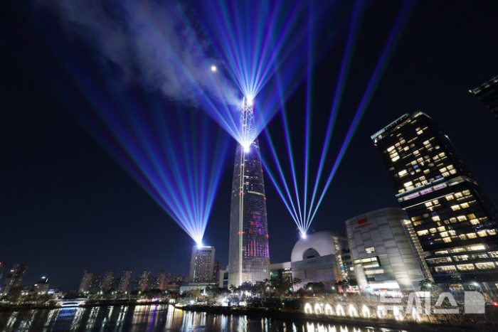 ▲병오년 새해를 맞아 1일 오전 서울 송파구 롯데월드타워에서 열린 ‘2026 롯데월드 카운트다운 행사’에서 새해를 축하하는 메시지와 함께 레인보우 레이저 라이팅 쇼가 펼쳐지고 있다. 2026.01.01.