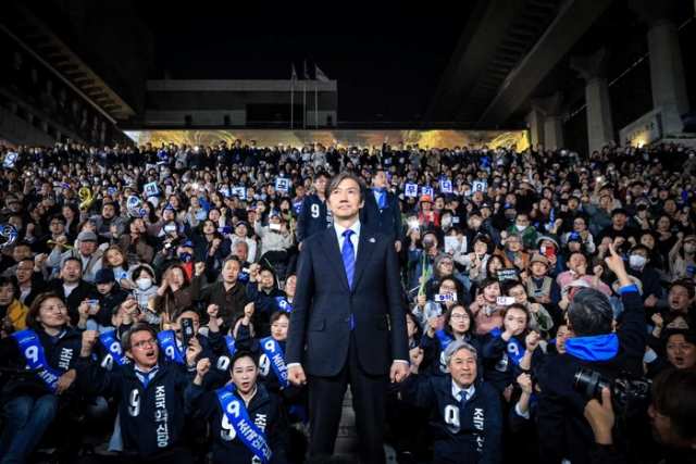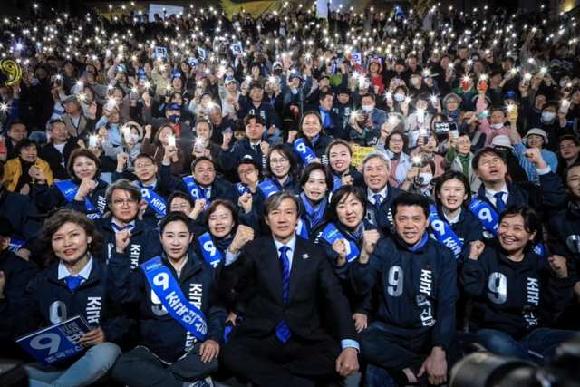 공식 선거운동 마지막날인 9일 ‘조국과 함께’ 일정을 서울 광화문 세종문화회관 앞 광화문 광장으로 선택한 조국혁신당 집회에는 이날 조 대표를 포함한 비례대표 후보 전원이 참석했으며 지지자 1만 여명이 운집했다.