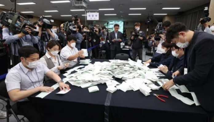 ▲2020년 5월 28일 경기도 과천 중앙선거관리위원회에서 4·15 총선 부정선거 주장에 대한 의혹을 해소하기 위해 관계자들이 사전투표 및 개표 공개 시연을 하고 있다. 한국일보 자료사진