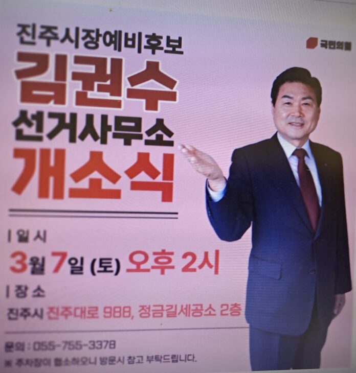 [경상뉴스=김영수 기자]경남 진주시장 선거에 출마한 김권수 예비후보 선거사무소 개소식이 시민과 당원, 지역 인사들이 참석한 가운데 성황리에 개최됐다.