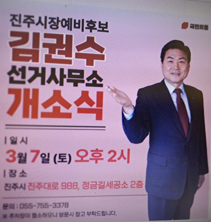 김권수 예비후보는 개소식 인사말에서“오랜 기간 지역사회와 공공기관에서 일하며 진주의 발전과 시민의 삶을 현장에서 보고 듣고 경험해 왔다”며“이제 그 경험을 바탕으로 진주의 새로운 미래를 만들기 위해 진주시장에 도전한다”고 밝혔다.