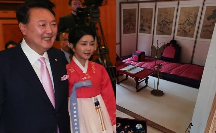 ▲윤석열 전 대통령과 부인 김건희 여사가 지난해 9월20일(현지시각) 프라하 시내 한 호텔에서 열린 체코 동포 만찬 간담회에 입장할 때의 모습. 오른쪽은 경복궁 건청궁 곤녕합 전경. 연합뉴스