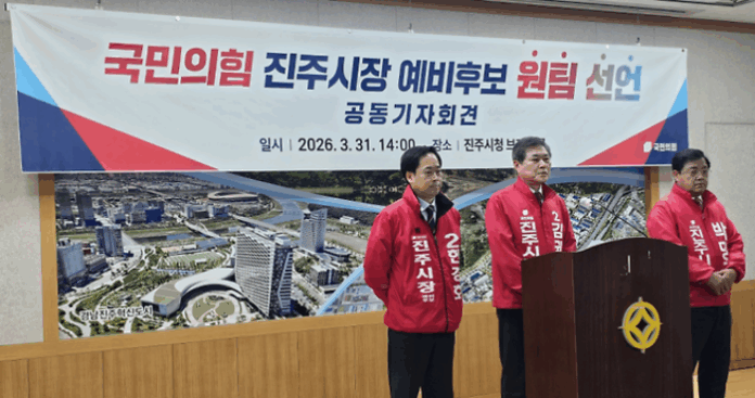 [경상뉴스=김영수 선임기자]국민의힘 진주시장 예비후보 김권수, 박명균, 한경호 후보는 29일, 진주시장 선거 승리를 위한 ‘원팀 경선 및 결단 촉구 결의문’을 발표하고 당내 후보들의 단합과 공동 대응을 강하게 요구했다.