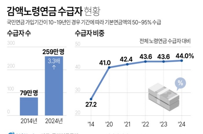 23일 국민연금공단 통계에 따르면 국민연금 가입기간이 10∼19년인 ‘감액노령연금’ 수급자는 2014년 79만444명에서 2024년 258만9천733명으로 10년 만에 3.3배 늘어났다
