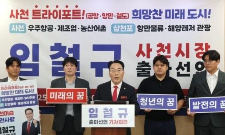 임철규(62, 국민의힘·사천1) 의원은 29일 오전 10시 30분 사천시청 브리핑룸에서 기자회견을 열고 “‘바다에서 하늘로, 그리고 세계로 나아갈 사천’이라는 슬로건 아래 우주항공복합도시 사천을 건설하겠다”고 밝혔다.