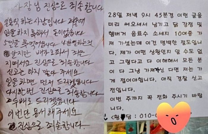 점주는 “제가 어떤 상황인지 알 수도 없고, 그렇다고 다 이해해서 모든 분이 다 그냥 가져가신다면 저는 가게 접어야 한다”며 “아직 경찰 신고 전이니 이번 주까지 꼭 전화 달라”며 자신의 전화번호를 남겼다.