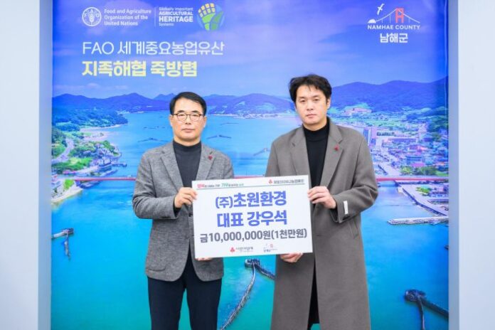 [경상뉴스=이경용 기자]경남 남해군은 지난 24일 ㈜초원환경(대표 강우석)에서 연말 이웃돕기 성금 1천만 원을 기탁했다고 밝혔다.