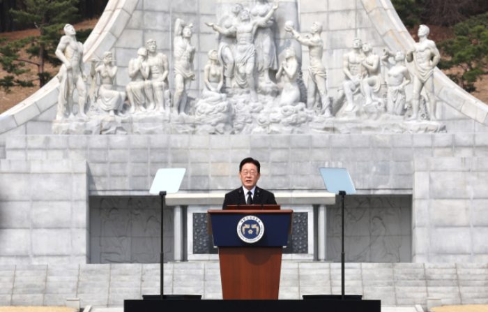 ▲이재명 대통령이 27일 국립대전현충원에서 서해수호의 날 기념사를 하고 있다. /ⓒ연합뉴스