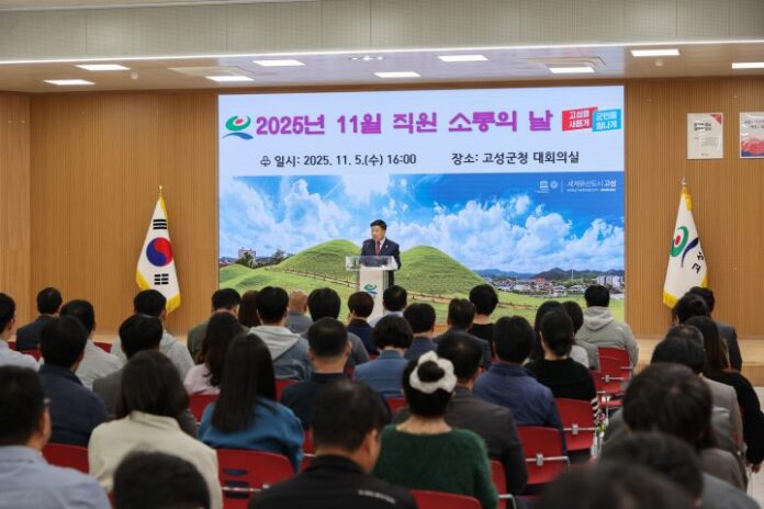 [경상뉴스=김용수 대기자]경남 고성군(군수 이상근)은 11월 5일, 군청 대회의실에서 직원 150여 명이 참석한 가운데 11월 직원 소통의 날을 개최했다.