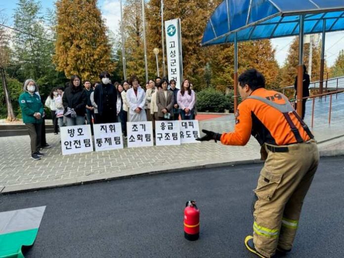 한편, 고성군보건소는 소방서와 합동 소방훈련을 매년 1회 정기적으로 실시하고 있으며, 올해 상반기에는 자체 자위소방대원으로 조직된 직원들을 대상으로 초기대응체계운영 및 화재예방 활동을 위한 소방교육도 진행한 바 이다.