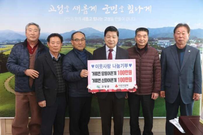 [경상뉴스=김용수 대기자]경남 고성군 거류면 당동어촌계(계장 김진석)와 신화어촌계(계장 박판식)는 2월 8일 고성군청을 방문해 어려움을 겪고 있는 이웃을 위해 각 100만 원씩, 총 200만 원을 기탁했다.