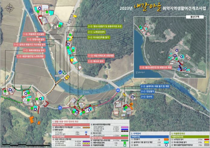 이번에 선정된 내갈마을은 배수시설 불량으로 도로, 주택 등의 침수가 빈번하고, 마을 안길이 협소해 긴급차량 이동이 어려우며 30년 이상 지난 건물이 많은 농촌지역이다.