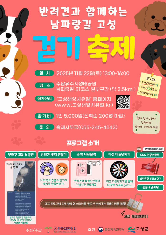 이상근 고성군수는 “이번 걷기축제는 반려동물과 함께하는 관광 콘텐츠를 통해 고성군의 아름다운 자연과 건강한 반려문화를 널리 알리는 계기가 될 것”이라며, “많은 분들이 가족 같은 반려견과 소중한 추억을 만들고, 고성의 매력을 만끽하길 바란다”라고 밝혔다.