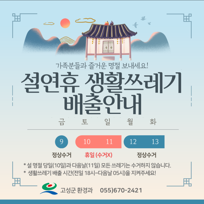 – 설 연휴 기간 중 2월 10~11일 생활 쓰레기 미수거 –