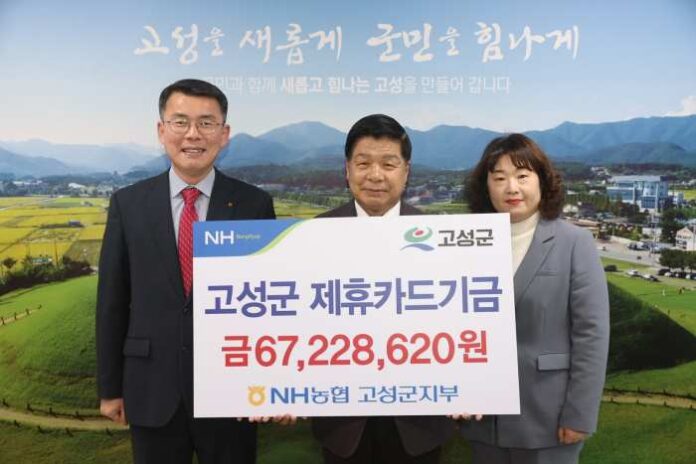 [경상뉴스=김용수 대기자]경남 고성군(군수 이상근)은 지난 5일 NH농협은행 고성군지부(지부장 김무성)와 ‘제휴카드 적립 기금 전달식’을 가졌다고 밝혔다.