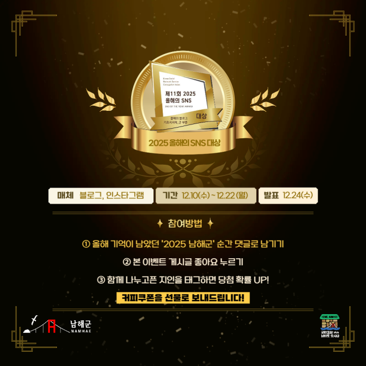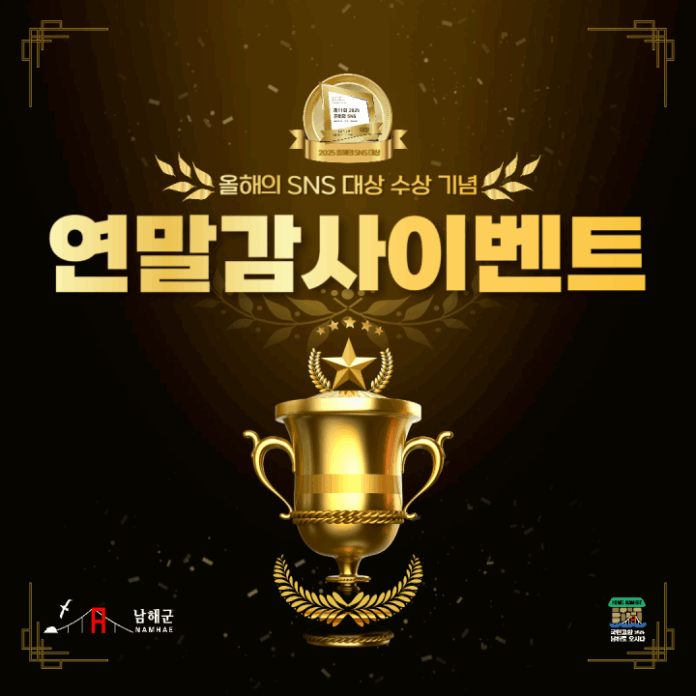 [경상뉴스=이경용 기자]경남 남해군이 ‘2025년 올해의 SNS 블로그 대상’ 수상을 기념해 풍성한 연말 감사 이벤트를 진행한다.