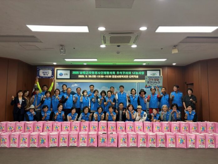 [경상뉴스=이경용 기자]경남 남해군은 남해군자원봉사단체협의회(회장 배경순)가 추석 명절을 앞둔 지난 30일 종합사회복지관 지하 다목적홀에서 추석 맞이 꾸러미 나눔 활동을 펼쳤다고 밝혔다.