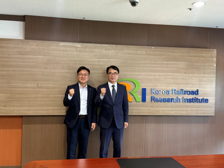 ▲장충남 남해군수와 한국철도기술연구원(좌) 관계자와 기념촬영한 모습
