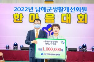 아울러 (사)한국생활개선 남해군연합회는 지난 18일 남해군 실내체육관에서 한마음 대회를 개회하면서 향토장학금 100만원을 기탁하였다.