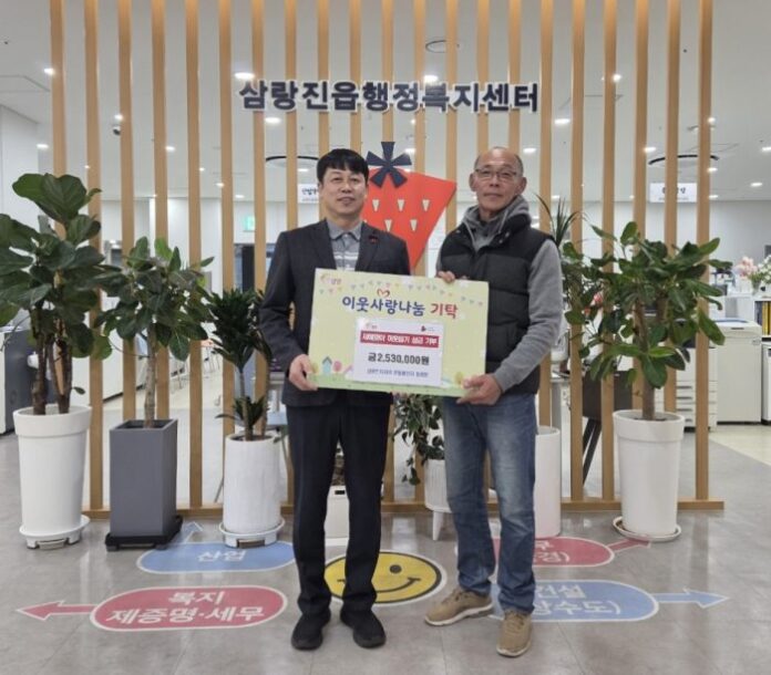 ▲유상민 삼랑진차차차 운동챌린지 동호회장이 삼랑진읍행정복지센터를 방문해 저소득 아동·청소년을 위한 성금 253만 원을 전달하고 있다.