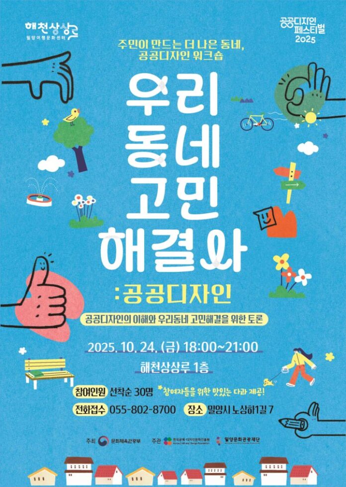 이번 행사는 문화체육관광부가 주최하는 공공디자인 페스티벌 거점 및 참여 프로그램 사업 공모에 선정돼 운영되는 프로그램이다. 공공디자인을 통해 일상 속 문제를 함께 고민하고 해결 방안을 모색하기 위한 자리로, 밀양시민 누구나 참여할 수 있다.