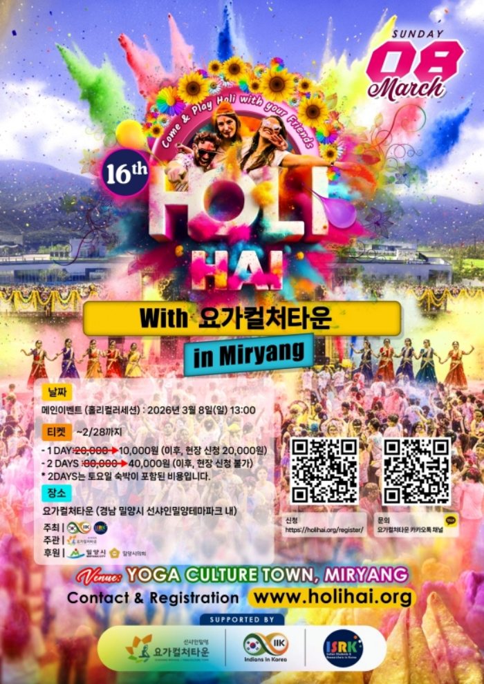 주한인도인공동체협회(IIK)가 주최하는 ‘홀리해이 페스티벌’은 2011년부터 이어져 온 축제로, 올해 제16회 축제는 밀양 요가컬처타운의 주관으로 진행된다.