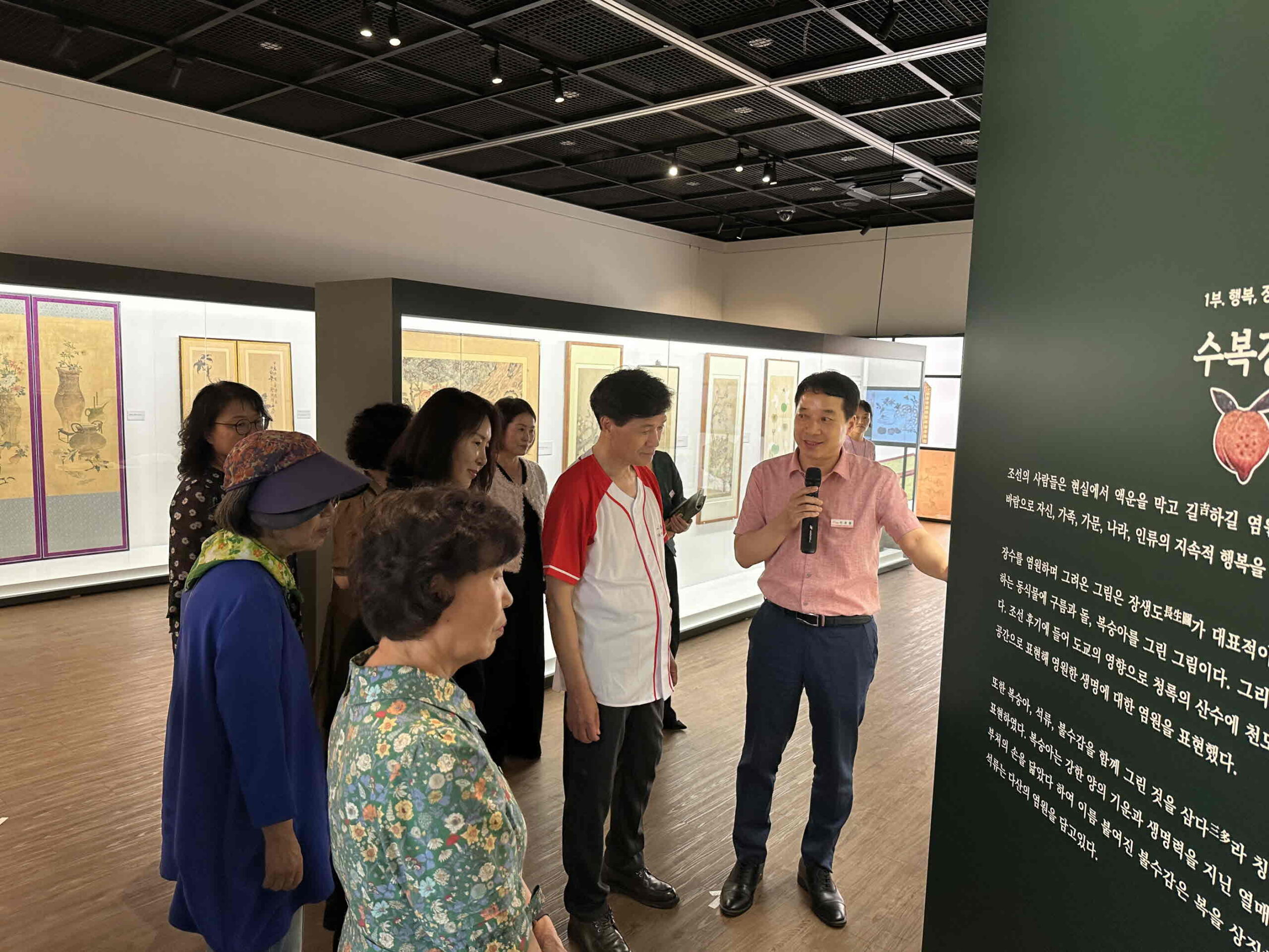 ▲안병구 밀양시장이 20일 밀양시립박물관에서 열린 특별기획전 ‘열매’ 전시 행사에서 참가자들과 작품 설명을 듣고 있다.