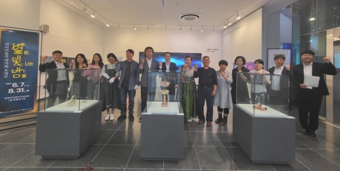 ▲7일 밀양아리랑우주천문대 1층 특별전시실에서 개최되는 미리미동국작가회 초대전 ‘별이 빛나는 밤에’ 전시회 개회식 참석자들이 기념촬영을 하고 있다.