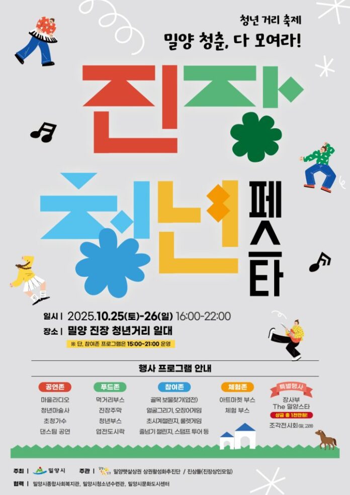 ‘밀양 청춘, 다 모여라!’라는 주제로 열리는 이번 행사는 지역 청년과 상인, 시민이 함께 어울리는 축제의 장으로, 진장 청년거리의 활성화를 목표로 추진된다.