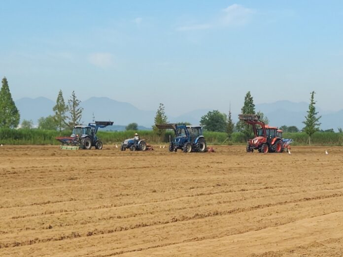 ▲경남 밀양시 하남읍이장협의회가 명례생태공원(명례리 1049-2 일원) 메밀밭에서 로터리 작업을 하고 있다.