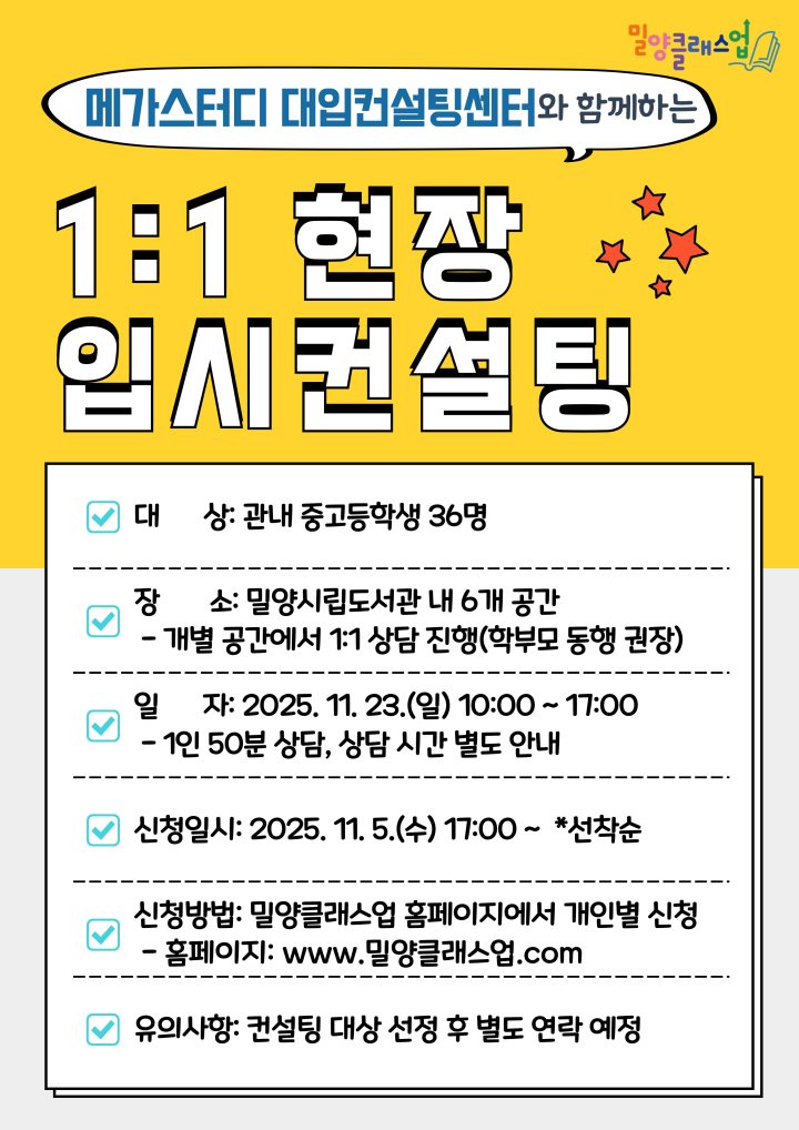 참가자는 밀양시립도서관 내 개별 공간에서 1:1 대면으로 50분간 상담을 받게 되며, 수능 성적 및 모의고사 결과, 희망 대학과 학과 등을 종합적으로 분석해 전형별 합격 가능성과 맞춤형 지원 전략을 세밀하게 안내받는다.