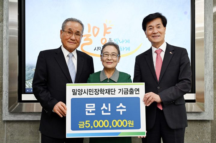 ▲밀양시 부북면에 거주하는 문신수 씨가 4일 밀양시장실을 방문해 장학기금 500만원을 전달하고 있다.(왼쪽부터 문신수 씨, 배우자 김순복 씨, 안병구 밀양시장)