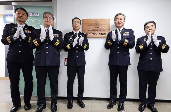 ▲18일 서울 서대문구 경찰청에서 선거사범 수사상황실 현판식에서 진행되고 있다. 왼쪽부터 박우현 사이버수사심의관, 홍석기 수사국장, 유재성 경찰청장 직무대행, 박성주 국가수사본부장, 백동흠 형사국장./ 연합뉴스