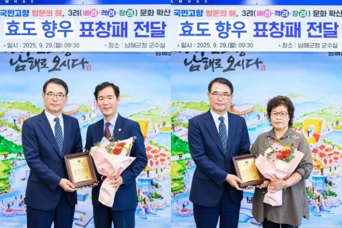 [경상뉴스=이경용 기자]경남 남해군(군수 장충남)은 9월 29일 군청 대회의실에서 ‘효도 향우 표창패 전달식’을 열고, 고향을 잊지 않고 부모님을 모시며 3려 문화 확산과 고향사랑 실천에 기여한 향우에게 표창패를 전달하였다.