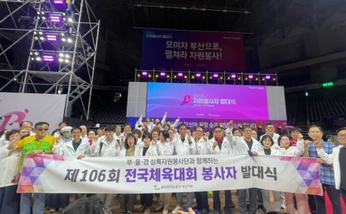 이날 부·울·경 상록자원봉사단장(봉사단장 하해천, 이하 ‘봉사단’)은 부산광역시장 및 부산광역시자원봉사센터장 등과 함께 체전 성공기원 퍼포먼스에 자원봉사자 대표로 참여했다. 자원봉사자들은 대회 기간 동안 대회장 질서유지, 부스 운영, 안내 및 행사진행 보조 활동을 할 예정이다.
