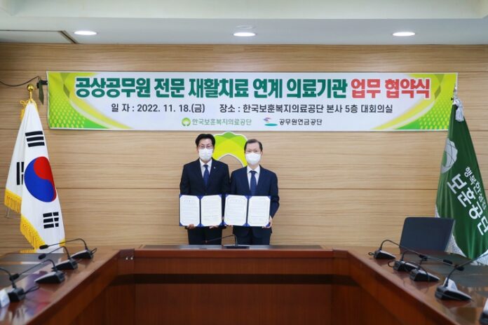[경상뉴스=박영환 기자]공무원연금공단(이사장 황서종, 이하‘공단’)은 18일 한국보훈복지의료공단과 공상공무원 전문재활 치료 활성화를 위한 업무협약을 체결했다.