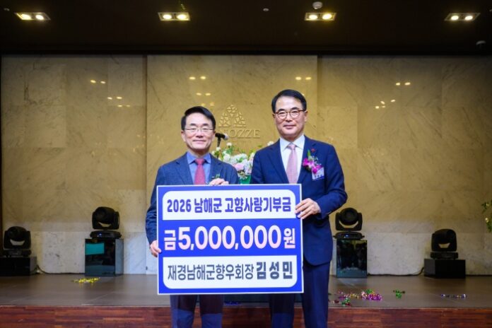 [경상뉴스=이경용 기자]재경남해군향우회 김성민 회장이 지난 6일 서울에서 열린 ‘2026년 재경향우회 신년하례회’에서 남해군의 발전을 위해 고향사랑기부금 500만 원을 기탁했다.