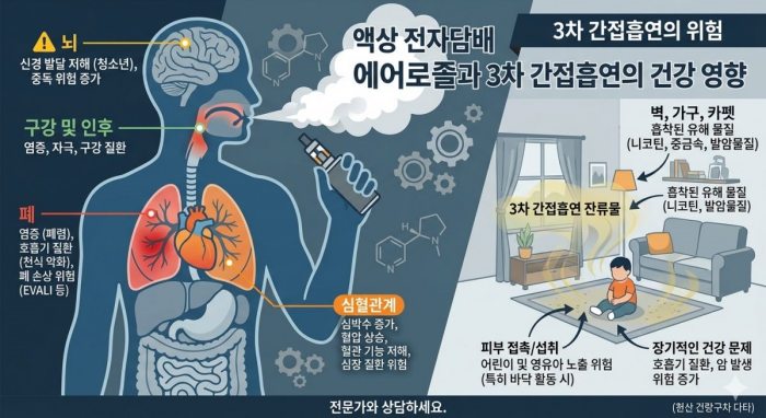 -액상 담배의 ‘에어로졸’, 폐는 물론 뇌·심혈관·대사 시스템 등 전신에 악영향/벽지, 가구에 달라붙어 수개월간 영·유아 등에 해 끼칠 수 있어-