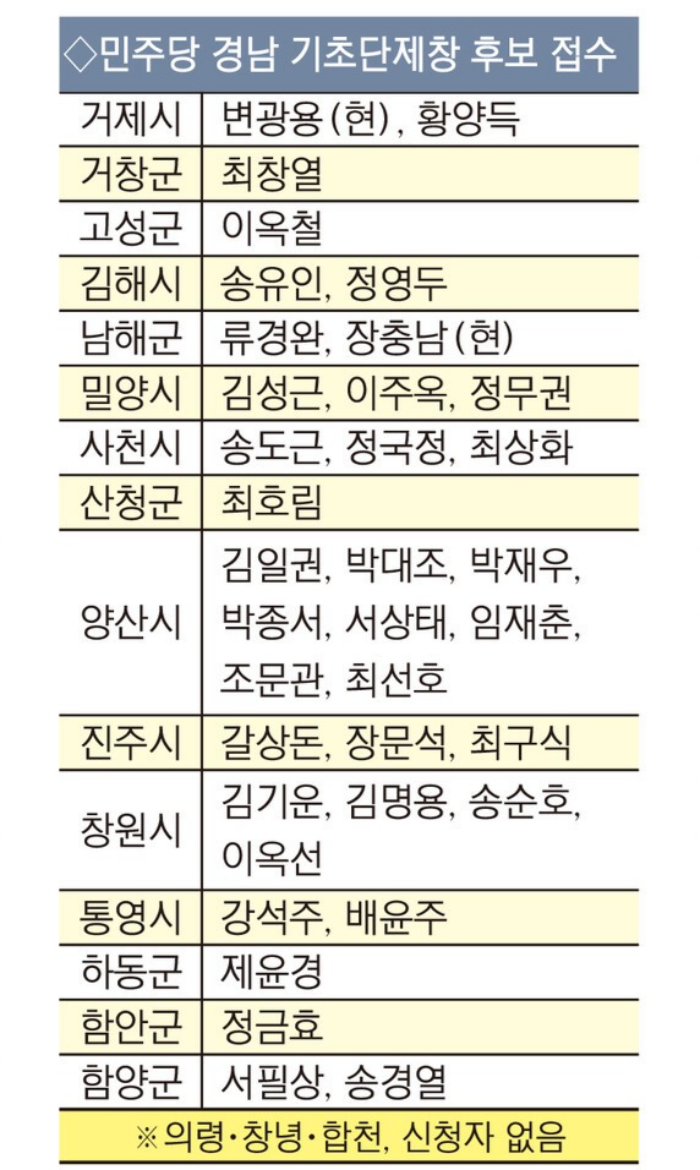 반면 의령군, 창녕군, 합천군은 공천 신청자가 없어 후보 발굴이 과제로 남았다.