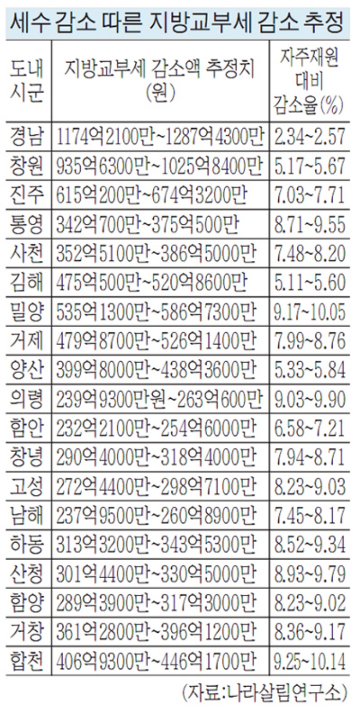 군 지역의 경우 합천군이 도내 10개 군 단위 중 감소액이 가장 커서 최대 446억원이 감소할 것으로 추정됐다. 합천군은 조사 대상인 83개 군 가운데 6번째로 많은 감소액을 기록했으며, 자주재원 대비 감소율이 최대 10.14%에 달할 것으로 나타났다. 이어 거창군(396억1200만원), 산청군(330억5000만원, 하동군(343억5300만원), 함양군(317억3000만원), 창녕군(318억4000만원), 고성군(298억7100만원), 의령군(263억600만원), 함안군(254억6000만원), 남해군(260억8900만원) 순이다. 합천군을 제외한 6개 군 지역의 자주재원 대비 감소율이 9%대로 추정됐다.