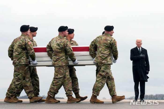 ▲[美 도버 공군기지=AP/뉴시스] 조 바이든 미 대통령이 2일(현지시간) 요르단에서 지난 28일 이란 후원 민병대의 드론 공격으로 전사한 미군 병사 3명의 운구 행사자에 참석해 경의를 표하고 있다. 미국은 이날 이란 후원 민병대에 대한 보복 공격을 시작했다. 2024.3.