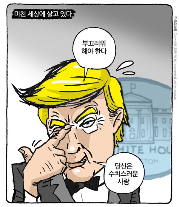 ▲ 최민의 시사만평 – 미친 세상 ⓒ최민 논설위원·시사만화가