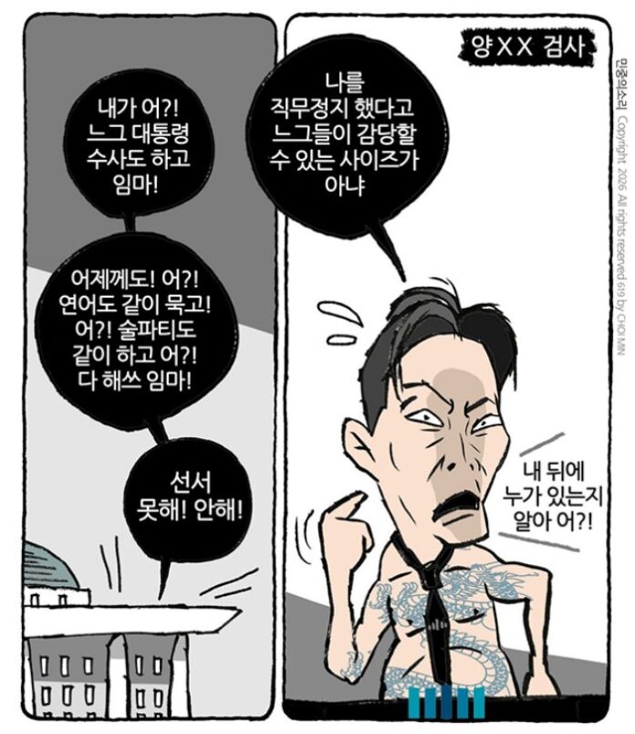 Home칼럼/논단/인물이주의 인물민중의 소리,『양XX 검사』 이주의 인물 민중의 소리,『양XX 검사』 2026년 04월 07일 ▲ 최민의 시사만평 – 양XX 검사 ⓒ최민 논설위원·시사만화가 Previous article민중의 소리,『끝까지 책임을』 관련기사 이주의 인물 민중의 소리,『끝까지 책임을』 2026년 04월 04일 인기뉴스 포토뉴스『진달래 만개한 밀양 종남산』 2026년 04월 07일 국민의힘 유해남-임철규 사천시장 예비후보「원팀 연대」공동 선언 2026년 04월 07일 경남 고성군, 군수 권한대행 체제에 따른 긴급 간부공무원 회의 개최 2026년 04월 07일 강훈식 대통령 비서실장, 오늘 카자흐·오만·사우디로 출국…『원유 확보 협의』 2026년 04월 07일