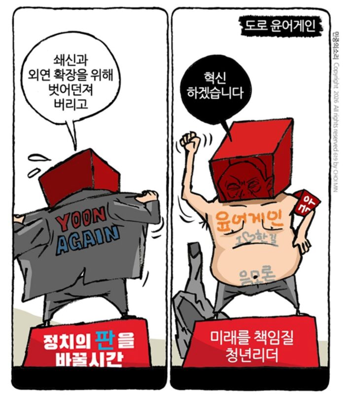 Home칼럼/논단/인물이주의 인물민중의 소리,『윤어게인 청년인재』 이주의 인물 민중의 소리,『윤어게인 청년인재』 2026년 03월 26일 ▲최민의 시사만평 – 윤어게인 청년인재 ⓒ최민 논설위원·시사만화가 관련기사 인기뉴스 국힘의힘 진주시장 예비후보 3인,「경남도당에 조규일 배제」요구 2026년 03월 26일 이 대통령『KF-21 성공, 방위산업 4대 강국 도약 발판…대통령으로서 무한한 자부심』 2026년 03월 25일 경남도『직장 내 젠더폭력, 고의 시 파면·해임 가능』 2026년 03월 25일 경남 밀양시, 고향사랑기부제 활성화 위해 온·오프라인 이벤트 추진 2026년 03월 25일