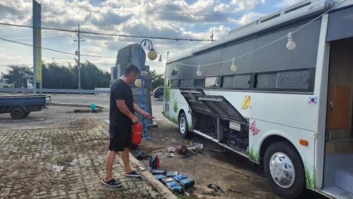 소방서에 따르면 이날 화재는 주차장에 주차된 35인승 캠핑버스 배터리에서 시작됐다. 소방 당국은 소방차 2대 등 장비 5대와 인력 15명을 동원해 신속하게 화재를 진압했다.
