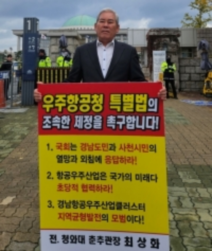 [경상뉴스=박영환 대기자]경남 사천시가 고향인 최상화 전 청와대 춘추관장은 6일 국회 정문 앞에서 우주항공청법의 조속한 통과를 촉구하는 1인 시위에 나섰다.