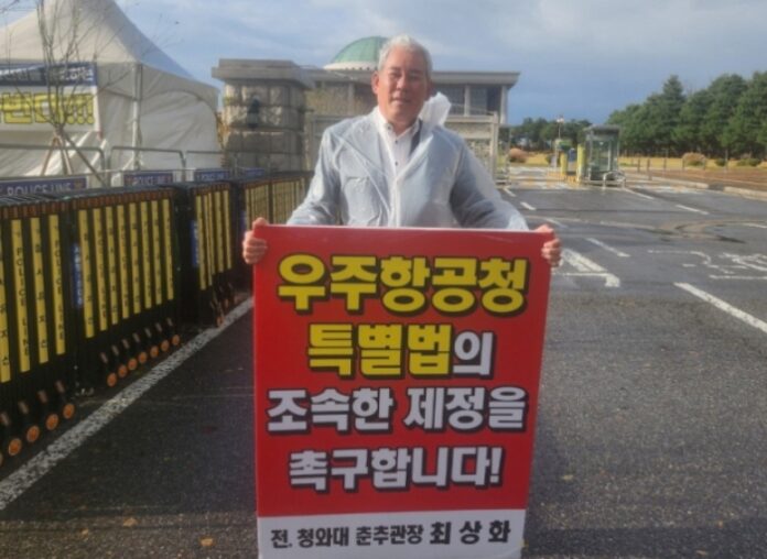 이에 따라 최상화 전 청와대 춘추관장은 ‘우주항공청 특별법의 조속한 제정을 촉구합니다’는 피켓을 들고 1인 시위에 나서 국회의 우주항공청 특별법 통과를 촉구했다.