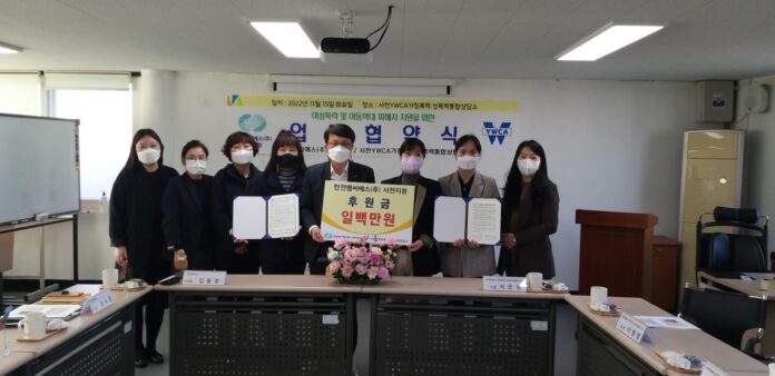 [경상뉴스=이경용 기자]사천YWCA가정폭력·성폭력통합상담소(소장 서은경)와 한전엠씨에스(주)사천지점(지점장 김용호) 지난 15일 ‘여성폭력 및 아동학대 피해자 지원’을 위한 협약식을 진행하였다.