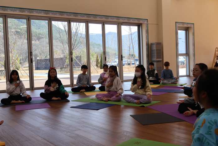 ▲어린이들이 요가컬처타운에서 명상을 하고 있다.